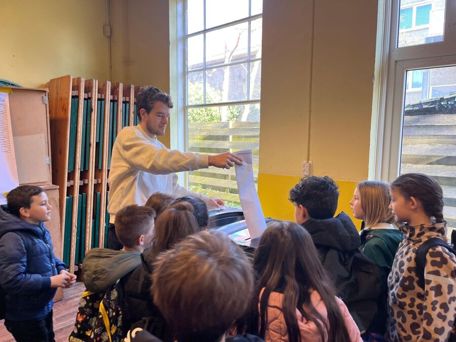 Groep 5 is deze week begonnen met een nieuw thema: de wijk. Een thema dat precies samenviel met de gemeenteraadsverkiezingen. De klas van meester Joeri is daarom woensdag eerst op bezoek geweest bij het stemlokaal in de Eemstraat, waar zij uitleg kregen over het stemproces.